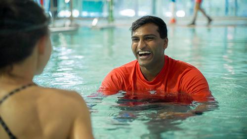 IMAGE CAPTION: Local swim instructor Dev Sappany, 24, in the pool at the Y NSW Ku-ring-gai Fitness and Aquatic Centre with an adult student