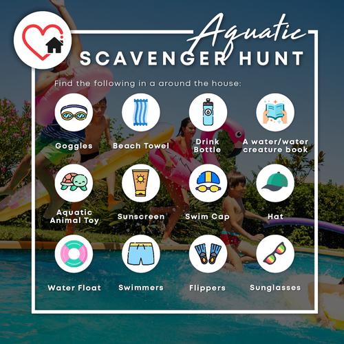This week's scavenger hunt is about exploring aquatics, to find some fun water based items and all the essential items needs to enjoy the water! How many from the list can you find? See if you can find them all!